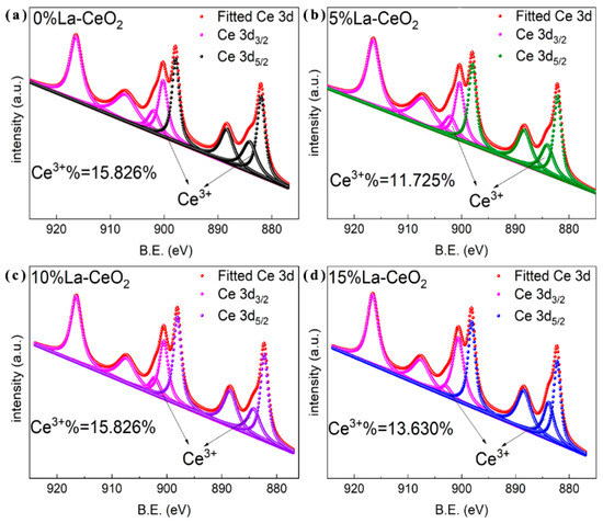 XPS of cerium in cerium oxide doped with lanthanum at different concentrations: (a) 0% La-CeO2, (b) 5% La-CeO2, (c) 10% La-CeO2 and (d) 15% La-CeO2.