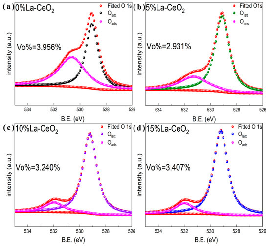XPS of oxygen in cerium oxide doped with lanthanum at different concentrations: (a) 0% La-CeO2, (b) 5% La-CeO2, (c) 10% La-CeO2 and (d) 15% La-CeO2.