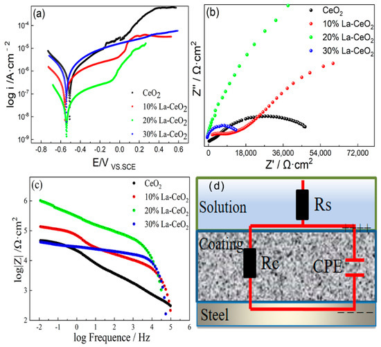 Electrochemical analysis of La-doped CeO2 coatings after UV irradiation for 12 h. (a) Polarization curves, (b) Nyquist plots, (c) Bode plots and (d) equivalent circuit.
