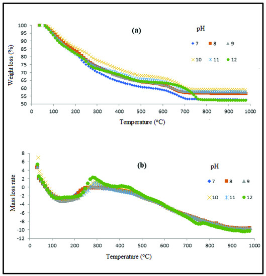 The comparison of TGA/SDTA data shown in Table 2 indicates that the maximum interaction between PPVA and AlPO4 occurred at pH 10, resulting in the formation of maximum char. Burrell et al. (2001) reported the pH dependency of Al−OH and Al−PO4 bonding that is reflected in the precipitation [15]. This analysis is in good agreement with our study results, where the observation of the highest weight residue (59%) and lowest water content (21% in the first stage) indicate the existence of maximum bonding of Al-PO4 at pH 10.