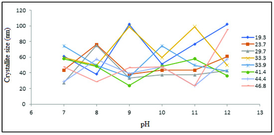 Figure 4 shows the comparison of crystallite sizes of all the samples calculated using the Scherer equation, and it can be observed that the samples of pH 7, 8, and 10 have a narrow particle size distribution. A further increase of the pH value exhibits variable crystallite sizes, but their crystallinity phases and amorphous nature remain the same. Such an observation can be linked to the phosphate particle growth and is based on the aggregation of globular primary nanoparticles, whereby the solution pH is determined by the number of available ions and this effects on the composition and crystallite size [16].