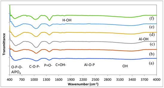 Figure 5 shows the comparison of FTIR spectra for the samples prepared with different precipitation pH (7–12), where the sample at pH 10 has the Al–OH characteristic stretching vibration band around 3786 cm−1. Other samples prepared at the pH of 7, 9, and 11 show the Al−O−P peak at 2202, 2253, and 2206 cm−1, respectively and the bending vibration of the H−O−H plane water molecules are observed at the lower wavenumber of 1730 and 1740 cm−1. Here, all samples are found to maintain the bands of OH (at 3371–3385 cm−1), C−OH, and a mixture of H−O−H (at 1640–1649 cm−1), P−O−AlPO4 (at 1371–1374 cm−1), C−O−P−AlPO4 (at 1027–1047 cm−1), HP−O−AlPO4 (at 822–824 cm−1), and O−P−O−AlPO4 (at 533–553 cm−1). The comparison of these band positions for the samples has provided information about the pH influence on the composite formation, i.e., we observed a shift to the band positions of −OH, C−OH, P−O−AlPO4, C−O−P-AlPO4, and O−P−O−AlPO4. With the pH increase from weak to strong alkaline, these vibrations are shifted to the lower wavenumber position. For the increase of pH from 7 to 9, a shift in the band position occurs to the higher wavenumber side, the sample of pH at 10 has a shift to the higher wavenumber side, the sample of pH 11 also shifts to the higher wavenumber side, and finally there is a shift back to the lower wavenumber for the pH at 12 sample (Figure 5a,c). Moreover, there is shifting of the C−OH band to the higher wavenumber upon the increase of pH from 7 to 10 and the pH 11 and 12 samples present intense PO-AlPO4 bands which can be linked to the hydrogen bonding in water, i.e., decreased at pH 11 but increased at pH 12 because of the breaking of Al−O−P bond and crystal structure.