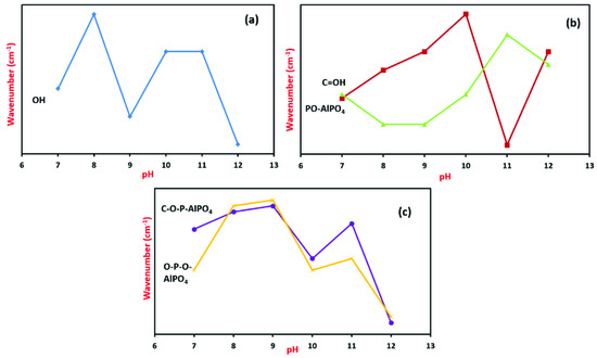 Figure 6 depicts the pH effect in the five FTIR bands selected from the nanocomposite samples. The corresponding bands are OH (3371–3385 cm−1), C=OH (1640–1649 cm−1) and PO−AlPO4 (1371–1374 cm−1) and (c) C−O−P−AlPO4 (1027–1047 cm−1) and O−P−O−AlPO4 (533–553 cm−1). As the pH of the solution increases from weak to strong alkaline, the bands shift to lower wavenumbers. For pH 7–9, the bands are shifted to a higher wavenumber, while for pH 10, the bands are shifted to a lower wavenumber. The bands are shifted to higher wavenumber at pH 11 and shifted back to lower wavenumber at pH 12, as shown in Figure 6a,c. Meanwhile, Figure 6b shows that the C=OH band is shifted to a higher wavenumber from pH 7 to pH 10, and pH 11 in the PO−AlPO4 band is related to the water and H bond. The water decreased at pH 11 but increased at pH 12 due to the breaking of the Al−O−P bond and crystal structure. The PO−AlPO4 band also displays a maximum intensity at pH 12.
