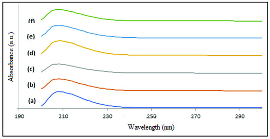 The comparison of UV-Vis spectroscopic analysis of PPVA-AlPO4 composite samples formed from various pH (7–12) is shown in Figure 7, where the spectra indicate the broad peak at 208 nm for all the samples with no peak shifting. We also observed sinusoidal behavior with a decrease of peak intensity from pH 7 to 9, a spike up at pH 10, and again a decrease with further pH increase. In general, the observation of changes in wavelength position of absorption peak can be linked to the presence of bonding and its type in a molecule. However, the intensity of peaks may be correlated to the development of microstructure and its nature where the mixing of immiscible layers and the particle size decreases with that of an increased pH and are due to the aggregation of globular primary nanoparticles from the reaction of H+ and OH− ions. The higher alkaline conditions contain a greater number of OH− ions in solution, which support the formation of particles with variable size and shape. The sample formed at pH 10 contains the Al-OH bonded with that of Al-PO4 and this influences the extent of the amorphous and crystalline phase of the composite. Moreover, the observation of maximum peak intensity for the sample of pH 10 indicates the homogeneous AlPO4 nanoparticulate system and this is due to the occurrence of maximum bonding between Al and PO4. The particles aggregated at pH 11 and 12 transformed into smaller particles and completely vanished at pH 13 as the solution became clear. As clearly shown, the formation of AlPO4 is affected by the pH and concentration of the mixture during synthesis. From the UV-Vis spectroscopic analysis, it is indicated that the formation of AlPO4 is strongly influenced by the solution pH and the concentration of reactants applied during the synthesis process.