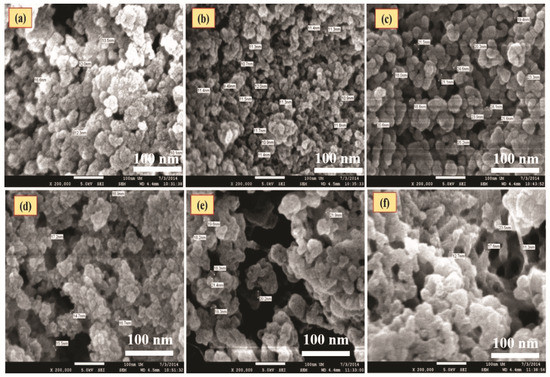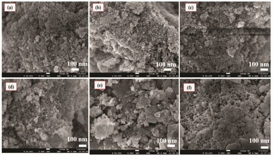 FESEM micrographs of PPVA-AlPO4 nanocomposite samples formed from different pH of (a) 7; (b) 8; (c) 9; (d) 10; (e) 11, and (f) 12 at 100 k magnification.