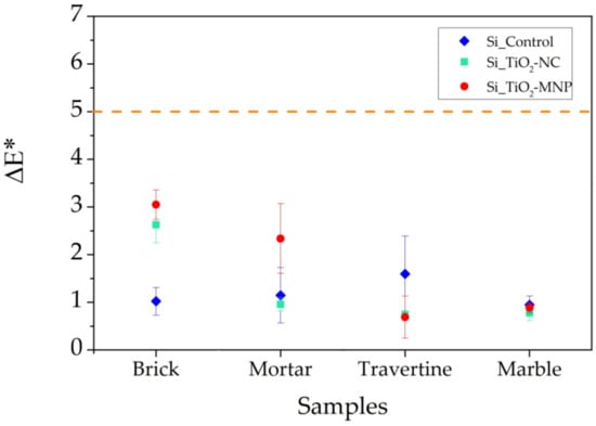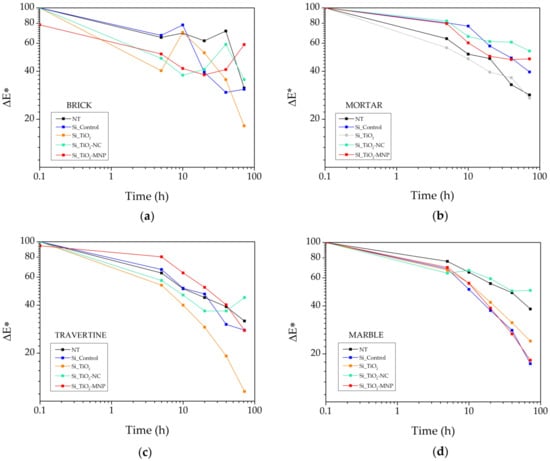 The photocatalytic activity of the TiO2 nanoparticles inserted in the coatings was evaluated under laboratory conditions. Stone samples were covered with a solution of 1 mM of methyl orange (Riedel-de Haën, Seelze, Germany) used as a staining compound, which was diluted in ethanol to allow quick evaporation of the liquid once applied on the stones. Due to the different absorption of the stones, 750 μL were used for brick and mortar and 500 μL for travertine and Carrara marble. Moreover, also untreated samples (NT) and those treated with the coating loaded with only titanium nanoparticles (Si_TiO2) were investigated as control. The stone specimens were placed in a ventilated chamber under a 365 nm UV light (Osram vitalux, Berlin, Germany), located at a distance of 20 cm, for 72 h [35]. The same colorimeter adopted to evaluate colorimetric changes on the surface due to the application of the coatings was used to estimate the photocatalytic degradation of methyl orange. The reference at time zero for the discoloration curves corresponds with the surfaces without methyl orange. The obtained data are reported after normalization to 100.