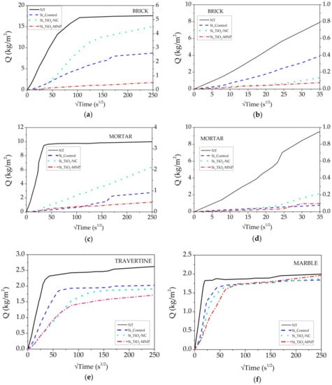 Transfer properties of liquid water and vapor were assessed by capillarity and water vapor permeability measurements, to investigate efficacy and harmlessness of the treatments. In fact, a proper protective coating should reduce the penetration of liquid water from outside and, likewise, should not prevent the outflow of water vapor towards the external side of the stone [47]. The capillary absorption kinetics of the stones, reported as a function of the square root of time (s1/2), before and after the application of the coatings, are displayed in Figure 3. The slope of the first part of each curve refers to the capillary water absorption coefficient (CWAC), while the second part measures the reached saturation. The reduction in CWAC with respect to untreated stones is reported in Table 4. All untreated stones reached a different level of water saturation, within a distinctive time interval, according to their different porosity. In fact, the quantity of water absorbed by brick was higher (~17 Kg/m2) than mortar (~10 Kg/m2). At the same time, travertine and Carrara marble absorbed a similar amount of water (~2.3 Kg/m2 and ~1.7 Kg/m2, respectively), which is lower with respect to the previous supports. Moving to the treated samples, all coatings showed a considerable reduction in water absorption with respect to the bare stones. Notice that, in the case of brick and mortar, data for the treated samples refer to the right vertical scale in Figure 3a–d, as Q changes by about one order of magnitude after treatment. For brick, a higher reduction of the initial slope of the curve is visible with Si_TiO2-MNP and Si_TiO2-NC compared with the Si_Control (Figure 3b). No differences are visible in the case of mortar (Figure 3d).