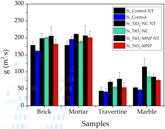 The measured water vapor permeability coefficient (g) for all treated specimens did not sensibly change with respect to the case of the untreated samples, within the standard deviation (Figure 4). No relevant differences were registered between the presence of NC and MNP. Therefore, our results indicate that the tested coatings preserved the original water permeability of the materials.