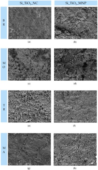 SEM images (1000×) of coated stones treated with Si-TiO2-NC and Si-TiO2-MNP: (a,b) brick (BR), (c,d), mortar (MO), (e,f) travertine (TR) and (g,h) Carrara marble (MA).