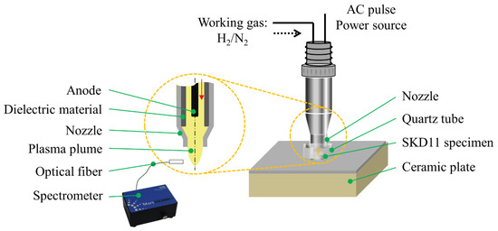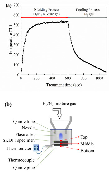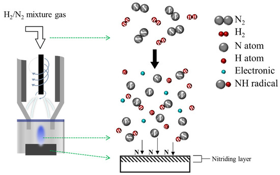 - Nagamatsu, H.; Ichiki, R.; Yasumatsu, Y.; Inoue, T.; Yoshida, M.; Akamine, S.; Kanazawa, S. Steel nitriding by atmospheric-pressure plasma jet using N2/H2 mixture gas. Surf. Coat. Technol. 2013, 225, 26–33. [Google Scholar] [CrossRef]