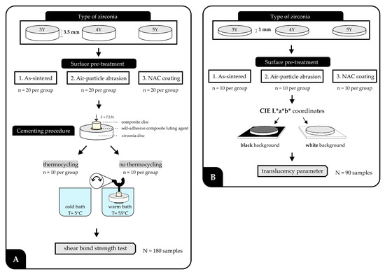 The flowchart of the experimental protocol for the (A) shear bond strength test and (B) translucency measurements.