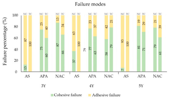 The area percentages of cohesive and adhesive failure mode after SBS testing are presented in Figure 3. For the AS groups, mixed failure modes with a high percentage of adhesive failure were observed. In contrast, mixed failure mode with a high percentage of cohesive failure was observed in APA and NAC groups. In addition, complete cohesive failure mode, although in a smaller portion, was also observed in the APA and NAC groups. After TC, the percentage of adhesive failure area slightly lowered in all the groups.