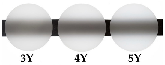 The 3Y zirconia studied, also known as high-translucent 3Y-TZP, contains less alumina in the matrix than conventional 3Y-TZP, thus hindering the formation of isolated, light obstructing alumina grains at the grain boundaries [36,37]. In the 4Y and 5Y zirconia, yttria content is increased to 4 and 5 mol.%, respectively, leading to a higher amount of larger, and less birefringent, cubic grains; lowering incident light scattering [37]. The measured differences in grain sizes for three types of zirconia and calculated TPs corroborate these findings (Table 2). TP increased with the grain size of 3Y to 5Y zirconia, consistent with correlations reported in previous studies [38]. Furthermore, the optical properties of 5Y zirconia are comparable to other translucent non-oxide dental ceramics while maintaining superior mechanical properties [39]. Therefore, its application can be extended to the fabrication of thin esthetic monolithic zirconia restorations.