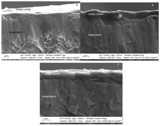 Micrographs showing cross sections of plasma-oxidized Ti6Al4V alloys during 1, 3, and 6 h are shown in Figure 1. It is important to say that in order to obtain these micrographs, specimens were introduced into liquid nitrogen and then they were fractured. Porous dimples are observed as result of plastic deformation during specimen fracture. Figure 1 shows that specimen oxidized during 1 h shows a continuous oxide layer less than 2.00 μm in thickness, and as the oxidation time increases, the oxide layer thickness increases also, reaching a thickness around 3.0 μm for specimen oxidized during 3 h. For specimen oxidized during 8 h, a nonuniform oxide layer less than 2.0 mm in thickness was obtained, which can affect the alloy corrosion resistance. Similar coating thicknesses were obtained in the TiO2 deposition using the plasma electrolytic oxidation method [44].