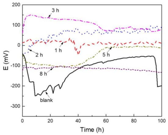 The change in the Ecorr value with time in artificial saliva solution for the plasma-oxidized specimens at different times is shown in Figure 3. For the blank, specimen that was not oxidized, the Ecorr value starts in a value around −50 mV but it rapidly shifts towards more active values during the first 10 h of testing. After this time, it shifts in the opposite direction, going towards nobler values.