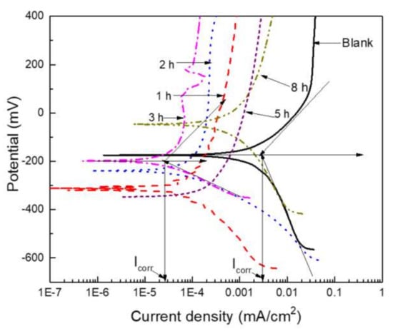 Figure 4. Effect of the oxidizing time on the polarization curves for Ti6Al4V alloy corroded in artificial saliva solution. In addition, schematic representation for the calculation of the Icorr values.