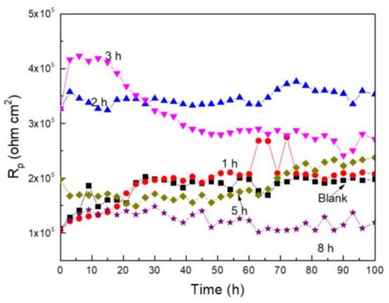 This figure, Figure 5, clearly shows that the specimen that was not plasma-oxidized (blank) or those oxidized during 1 h and 8 h exhibited the lowest Rp values, and thus, the highest Icorr values. On the other hand, specimen oxidized during 2 h and 3 h had the best corrosion performance, since the alloy exhibited the highest Rp values at these oxidizing times, in agreement with the results obtained from polarization curves. During the first 15 h of testing, specimen oxidized during 3 h exhibited the highest Rp value, but after 15 h, the Rp value started to decrease, probably to the dissolution of the protective oxides, and after 30 h of testing, the obtained Rp value was lower than that obtained for specimen oxidized during 2 h. Specimen oxidized during 2 h exhibited an Rp value very stable with time, and remained constant during the whole test, indicating that oxides produced on this specimen were more stable than those produced for specimen oxidized during 3 h. For specimen oxidized during 5 h, the Rp value increased monotonically with time, probably due to establishment of more protective oxides. This way, LPR experiments confirm the results found in the polarization curves, i.e., the best corrosion resistance is found with specimen oxidized during 3 h; lower or higher oxidation times reduce the alloy corrosion resistance.