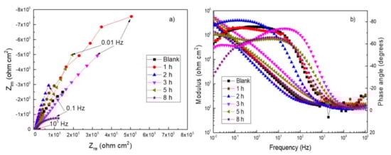 The EIS method is usually used to characterize the uniform corrosion and the kinetic behavior between the electrode surfaces and solutions. Nyquist curves represent that the imaginary part (Zim) of the impedance is a function of the real part (Zre), which reflects the impedance of electron transfer process in the electrode surface. The Nyquist plots, which reflect the electron transfer impedance from the electrode surface to the solution, are presented in Figure 6a for untreated and plasma-oxidized Ti6Al4V alloy. Nyquist data indicate that, with the exception of specimens oxidized during 3 h, the impedance is approximately characterized by one large capacitive semicircle effect at all frequency values, indicating a charge-controlling corrosion mechanism. For specimens oxidized during 3 h, data display one depressed, capacitive semicircle at high and intermediate frequencies, followed by second capacitive semicircle at lower frequency values. Different research works have indicated that the oxide formed on Ti alloys consists of a duplex oxide, which consist of an outer porous layer and an inner compact layer, which acts as barrier layer [49,50,51]. The high-frequency loop is related to the electrochemical reactions taking place at the inner barrier layer at the electrolyte/passive film interface, whereas the low-frequency loop is related to reactions taking place at the outer porous passive film/solution interface. In these plots, a larger-radius capacitive loop corresponds to a lower corrosion rate. When the oxidation time increases up to 3 h, the capacitive loop diameter increases, which indicates that the resistance of electron transport increases, as a result of restraining or delaying the corrosion of the surface in the artificial saliva solution. The shape of the semicircle is not affected by the oxidation time, which indicates that the corrosion mechanism remained unaltered. However, the diameter of the semicircle changes with the oxidation time, which can be seen more clearly in the Bode plots, Figure 6b, where there is an increase in the impedance value as the oxidation time increases, obtaining its maximum value at a time of 3 h of treatment. For a further increase in the oxidation time, the impedance value decreases, decreasing, thus, the alloy corrosion resistance, in agreement with results given above by polarization curves and Rp measurements.