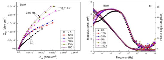Figure 6. Effect of the oxidizing time on the (a) Nyquist and (b) Bode diagrams for Ti6Al4V alloy corroded in artificial saliva solution during 100 h.