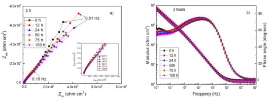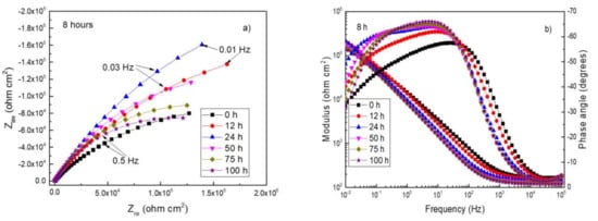 EIS data in both Nyquist and Bode formats for Ti6Al4V alloy plasma-oxidized during 0, 3, and 8 h at different testing times of exposure in artificial saliva solution are given in Figure 7, Figure 8 and Figure 9. For specimen without treatment and that oxidized during 8 h, Figure 7 and Figure 9, both Nyquist diagrams are very similar to each other. Nyquist data display one single depressed, capacitive semicircle at all frequency values with the center at the real axis and the diameters increasing as time elapsed, indicating that the corrosion mechanism remained unchanged during the whole testing time. On the other side, Bode diagrams indicate a typical capacitive behavior where the total impedance increases as time elapses whereas the phase angle value increases with time remaining constant over a wide frequency interval, close to −80°, typical of a material covered with a very stable passive film.