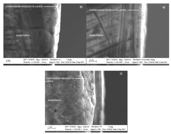 This increase in the Ri value can be due to an increase in the thickness of both the compact inner barrier and the external porous layers. It is known that the layer thickness is inversely related to the calculated capacitance [16,50]. The thicker layer is formed on the substrate, and the harder corrosive ions penetrate throughout, resulting in a more corrosion-resistant performance. According to the simulated results shown in Table 2, the lower CPE value, and thus the thickest oxide inner and outer layers, was obtained for specimen oxidized during 3 h, which exhibited the best corrosion performance. Finally, values for no and ni close to 0.5 mean a high surface roughness due to a high dissolution rate, whereas a value close to 1 implies a low surface roughness due to a low metal dissolution rate. As shown in Table 2, the lowest values for these parameters, 0.7 and 0.8, were obtained for untreated specimen, indicating a high corrosion rate, whereas the highest value, 0.9, was obtained for specimen oxidized during 3 h, indicating a low surface roughness due to a low dissolution rate. Cross section micrographs of corroded Ti6Al4V alloy oxidized at different times are shown in Figure 11. This figure shows the layer of corrosion products formed on top of specimens oxidized at different times, but the presence of external and internal layers on such a layer is not clear. What is possible to see is that the thickness of such a layer is bigger for specimens oxidized during either 1 h or 8 h due to a high corrosion rate of substrate, whereas the film formed on top of specimen oxidized during 3 h is thinner due to a lower corrosion rate of substrate, as found above.