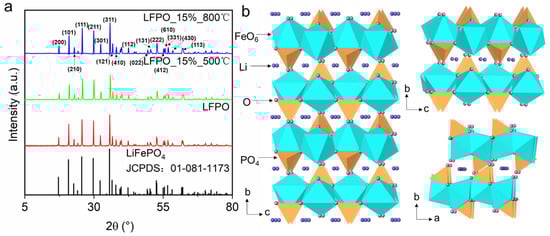 (a) XRD patterns of LFPO, LFPO_15%_500 °C and LFPO_15%_800 °C, (b) Schematic illustrations of the crystal structure of LiFePO4 (purple ball: Li, pink ball: O, blue octahedron: FeO6 and yellow tetrahedron: PO4).