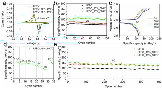 (a) Cycle voltammograms at a scan rate of 0.1 mV·s−1 in a voltage range of 2.5 to 4.2 V. (b) Cycle performance of LFPO, LFPO_15%_500 °C and LFPO_15%_800 °C at 2 C. (c) Galvanostatic charge and discharge curves of LFPO_15%_800 °C at the current of 2 C. (d) Rate performance of LFPO_15%_800 °C at rates of 0.1, 0.2, 0.5, 1, 2, 5 C and back to 0.1 C. (e) Cycling performance of LFPO, LFPO_15%_500 °C and LFPO_15%_800 °C measured at a current density of 5 C.