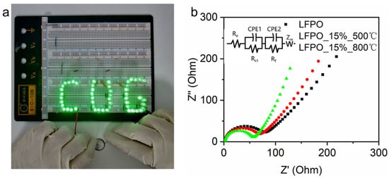 In Figure 5a, we can clearly see that a modified LFPO battery can light up 51 LED lights with CUG in the row. It is safe to say that the modified LFPO battery maintained high power, high capacity and high stability well during the charging/discharge process. Nyquist plots (Figure 5b) present a semicircle and a quasi-straight line, which are associated with the charge transfer resistance (Rct) and the impedance of Li+ diffusion in solid materials (Warburg impedance, Zw), respectively. The specific fitting data of EIS is presented in Table S2; the Rct of LFPO_15%_500 °C and LFPO_15%_800 °C are lower than those for LFPO and the Zw of LFPO_15%_500 °C and LFPO_15%_800 °C are higher than those for LFPO, indicating that the electronic transmission capability of the LFPO_15%_500 °C and LFPO_15%_800 °C electrodes are superior to LFPO. Based on the data obtained from the EIS test, the diffusion coefficient values of the lithium ions (D) can be calculated using the formula D = 0.5 (RT/AF2σwC)2, where R is the gas constant, T is the temperature, A is the area of the electrode surface, F is Faraday’s constant, σw is the Warburg factor and C is the molar concentration of Li ions [49]. The calculated lithium diffusion coefficient value for LFPO is 5.9 × 10−13 cm2·s−1, LFPO_15%_500 °C is 8.9 × 10−13 cm2·s−1 and LFPO_15%_800 °C is 3.36 × 10−12 cm2·s−1. It is obvious that the lithium diffusion coefficient values of LFPO_15%_500 °C and LFPO_15%_800 °C are much higher than that of LFPO. The results show that the three-dimensional carbon-coated LFPO can improve the lithium ion diffusion rate, which can improve the specific capacity of LFPO.
