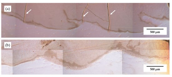 Figure 4 displays the surface topography of the coatings. The laser cladding tracks on the substrate are obvious and easy to recognize. Some cracks, marked with white arrows in Figure 4 and Figure 5, along the direction perpendicular to the laser scanning path were found on the surface of 55NiTi coating. The formation of these cracks was observed during the cooling stage after the cladding process, which is attributed to the release of the thermal stress caused by the rapid cooling [26]. However, no cracks were found on 55NiTi + 5Ni coating, the surface of which was plain and smooth. Figure 5 shows the cross-sectional morphologies of the coatings, and it can be seen that the cracks on the 55NiTi coating surface penetrated the whole cladding layer. However, both coatings formed the expected metallurgical bonding with the substrate. In addition, the fusion line between coating and substrate was more continuous and uniform in the 55NiTi + 5Ni coating. Studies have revealed that the phase transition temperature of NiTi alloy decreases with increasing content of Ni [22]. That is to say, the energy required for its phase transformation is reduced by increasing the content of Ni. With the same amount of heat input, while the coatings were fabricated under the same parameter settings, the phase transformation taking place in the 55NiTi + 5Ni coating would be more sufficient and close to thermodynamic equilibrium, which is beneficial to form a steady and uniform microstructure. As a result, the transition zone in the 55NiTi + 5Ni coating was also wider than that in the 55NiTi coating.