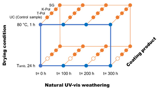 Figure 1, which involves the different drying conditions, natural UV-vis weathering time, and the specific coating product applied. The control samples (i.e., uncoated samples) did not undergo oven drying conditions since they were not spray-coated.