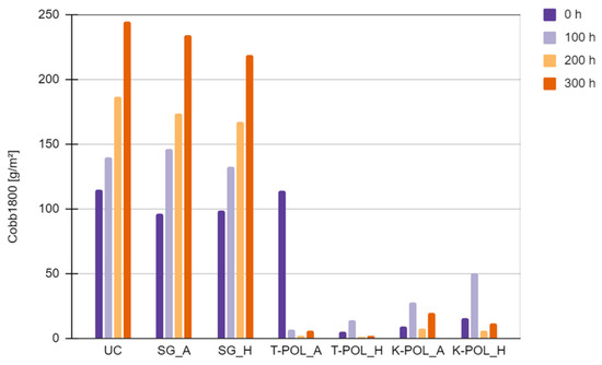 Water absorptiveness (Cobb test) for all the coatings, for both weathered (100 h, 200 h, and 300 h) and unweathered (0 h) samples.