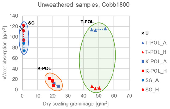 For the sake of clarity, the “X_Y” nomenclature was adopted, where “X” is the coating product (UC: uncoated; M-POL: talc-filled polymeric coating; K-POL: kaolin-filled polymeric coating; SG: hybrid silica sol-gel), whereas “Y” is the drying condition (A: ambient conditions; H: oven).