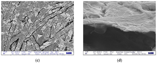 Surface micrographs for the coated samples. (a) Plate-like filler (cross-section) and drop-like defects in T-POL_H coating (M = 1000×); (b) Cross-section of the K-POL_A coating (M = 1000×); (c) SG_A SEM surface micrograph (M = 500×); (d) Cross-section of the unweathered SG_A coating (M = 5000×).