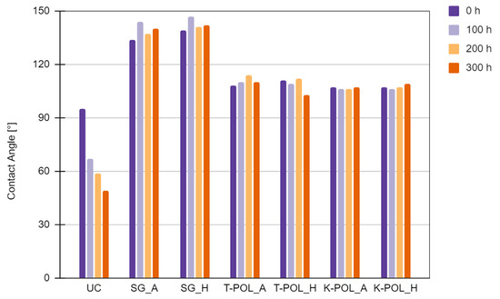 Specifically, all the coatings were tested before weathering (t = 0 h), at 100 h, at 200 h, and at 300 h of UV-vis radiation.