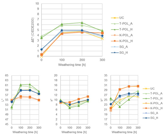 (Above) ΔE* (CIEDE2000) progression for the different samples. (Below) L*, a*, and b* coordinates evolution in time.