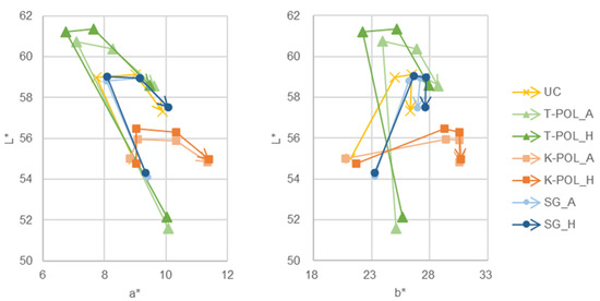 (Left) L* vs. a* coordinates evolution for all the samples; (Right) L* vs. b* coordinates evolution for all the samples. Arrows indicate increasing time in measurements recording.