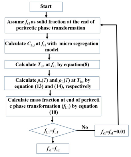 Based on the ratio and the mass fraction of the liquid phase and the δ-ferrite at Tp, the mass fraction of each phase at the end of the peritectic phase transformation during solidification can be obtained. When no liquid phase remains at the end of the peritectic phase transformation, the solid fraction at the end of the peritectic phase transformation (fsE) is 1. When the liquid phase remains at the end of the peritectic phase transformation, fsE is less than 1. Firstly, the mass fractions of the γ-austenite (fγ′) and the liquid phase (fL′) at the end of the peritectic phase transformation were calculated, and then the iteration method was used to calculate fsE. The process of calculation is shown in Figure 2.