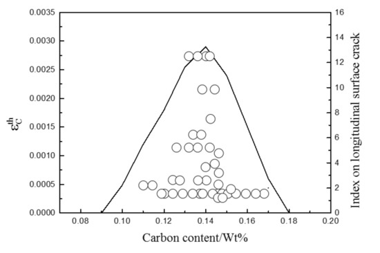 The comparison of the index of the longitudinal surface cracks of 0.14Si–0.36Mn–0.016P–0.013S steel under the different carbon content in the literature [34] with the calculated strain during the peritectic phase transformation in the brittle temperature range (ZDT < TB < LIT) is shown in Figure 4. The index of the longitudinal surface cracks is a value expressing the longitudinal surface crack ratio. In view of a current slow cooling method used in continuous casting, the cooling rate is set as 10 °C/s. The carbon content at which the maximum number of longitudinal surface cracks appear is about 0.13~0.14 wt%, which agrees well with the experimental results in the literature [34].