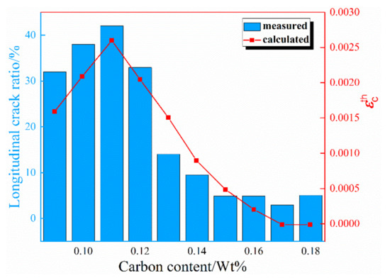 In order to further verify the accuracy of the calculation method presented in the current work, the longitudinal crack ratio of the continuous casting slabs statistically obtained from an actual steel plant was used to compare with the calculation results. The comparison of the measured data and calculated data by present model is shown in Figure 5.
