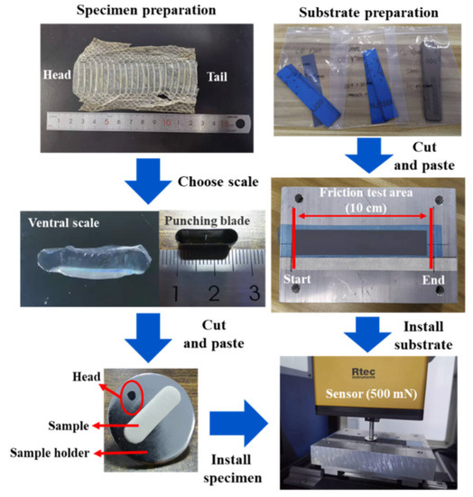 D. rufozonatum spreads widely and lives near mountains, plains, forests, and waters in East Asia. In this experiment, the specimens were the exuvium from ventral scales of three adult individuals of D. rufozonatum. All three individuals were measured about 0.91 ± 0.1 m in length and 0.17 ± 0.06 kg in weight (Figure 1). When the snake moved, the contact region between the ventral scales and ground was about 15 mm in length and 4 mm in width. Thus, the specimens were cut into a shape (about 15 mm × 4 mm, Figure 2) similar to the round parallel key by using a customized punch, which mimicked the snake scale shape (Figure 2). Then, the specimens were mounted on the specimen holders by double-sided foam tape (Changdasheng Electronics Co., Ltd., Shenzhen, China) with a thickness of approximately 1 mm and acted as a cushion like snake scale issue. For the tests carried out under WLC (water-lubrication conditions), the specimens were soaked in distilled water for about half an hour before punching.