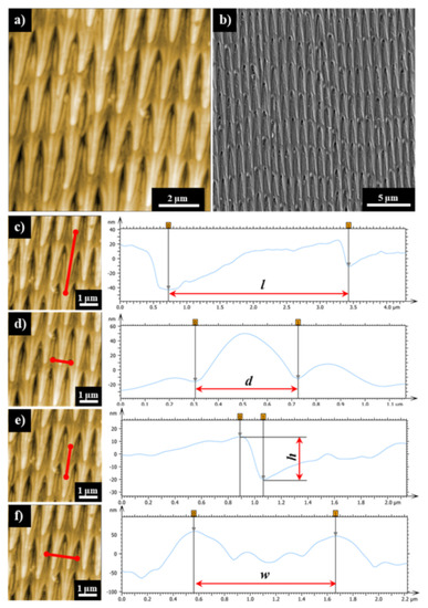 Microstructures of ventral scales surface and definition of micro-convex body sizes. (a) AFM (10 μm × 10 μm), (b) SEM (5 kV, 10,000×), (c–f) the dimension parameters of the ventral scale. l: the length of the ridge; d: the diameter of the microstructure end; h: the height of the microstructure end; w: the distance between two adjacent microstructures.