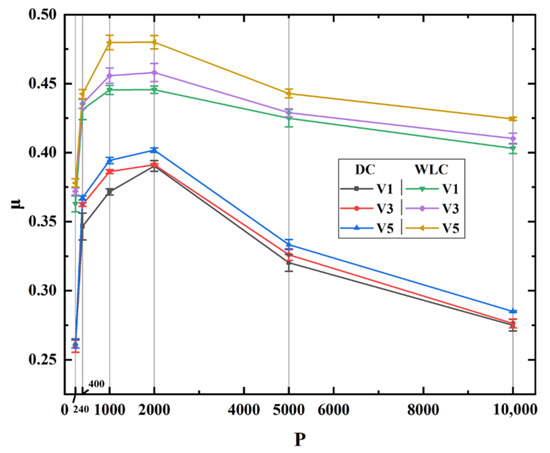 Based on Figure 5, the curve indicated that the ventral scales of WLC showed higher COF compared to DC. At all the speeds, the smallest differences of COFs between DC and WLC existed in the sandpaper size of P2000 but still achieved approximately 0.055, 0.067, and 0.078 (the difference value of COF between DC and WLC), respectively. In comparison, the maximum differences could reach to 0.128, 0.134, and 0.140 in the sandpaper size of P10000, respectively. As shown in Figure 5, the sliding speed was another factor that affected the COF of ventral scales. The COF of the ventral scales elevated from 1 mm/s to 5 mm/s under all the contact conditions.