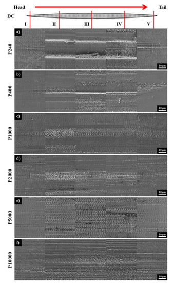 As shown in Figure 6a, the scale surface showed significant bulges under substrate roughness of P240. The boundaries of the grinding marks were obvious. The width of the wear scar was about 20 μm, and the widest part of the uplift was about 6 μm. The fatigue cracks existed on the edge of the uplift. Plastic deformation occurred in wear scar of the zone I without any material flaking off. Meanwhile, the grinding marks and scratches became deeper and deeper from the beginning to the end in zone I. However, in zone II, III, and IV, the abrasive grains of substrate grinded not only the micro-convex structures on the scale surface but also the microfibers inside the scales. The wear scar in zone V was narrowed and the degree of wear was reduced.