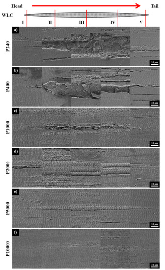 Comparison of wear scar in WLC between (a) P240, (b) P400, (c) P1000, (d) P2000, (e) P5000, and (f) P10000 (5 kV, 5000×). The red arrow indicates the scratch direction.