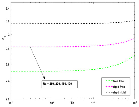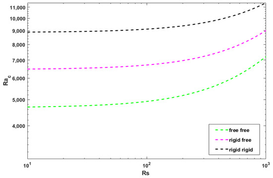 Rs increases; therefore, the onset of convection is delayed with the solutal Rayleigh number, hence system is stable. This may be interpreted from the definition of solutal Rayleigh number that the value of solutal Rayleigh number directly depends upon the difference between concentration at upper and lower plates. Hence, the difference between concentrations plays a role in determining the system’s stability; therefore, the solutal Rayleigh number helps for delaying the onset of convection. As