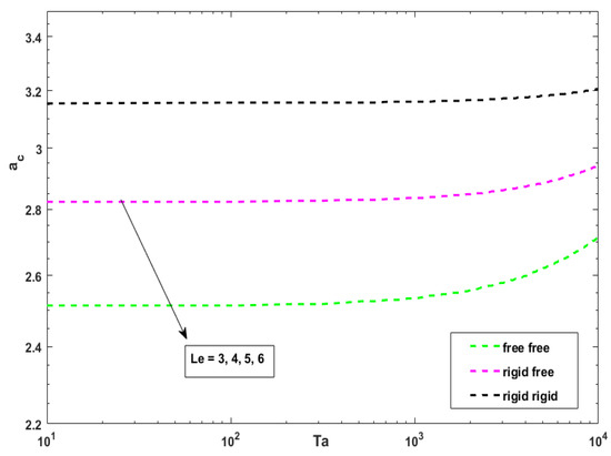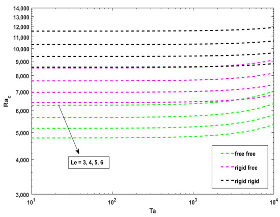 Le shows destabilization in the system. Alternately, the fixed value of molecular diffusivity Lewis number directly depends on thermal diffusivity. So thermal diffusivity causes a destabilization effect. Taylor number can stabilize the system as expected from