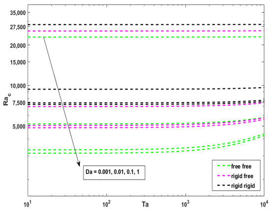 Rac, so the system is unstable, and the onset of convection enhances for the Darcy number. Moreover, as we observed in