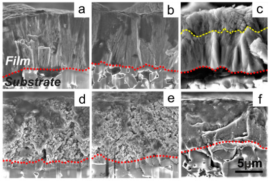 SEM cross-sectional images of deposited films are presented in Figure 1. With an increase of the Al target current, the structure of sputtered Hf–Al–C film is transformed from a dense columnar structure (Figure 1a,b, Al current = 1, 2 A, Al concentration 5.6, 9.2 at.%) through a mixed columnar-porous structure (Figure 1c, Al current = 3 A, Al concentration 9.5 at.%) to a porous dendrite-like structure (Figure 1d,e, Al current = 4, 5 A, Al concentration ~10 at.%).