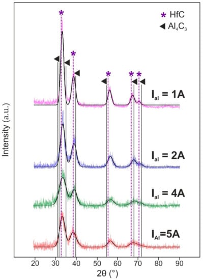 In order to determine the cause of Hf–Al–C system microstructure transition, XRD analysis was used. The value of full width at half maximum (FWHM) for deposited films, measured for the main peak centered at 2θ = 31°, was 1.8° (IAl = 1 A), 2.6° (IAl = 2 A), 3.07° (IAl = 4 A) and 3.9° (IAl = 5 A). An increase of the FWHM value for the Hf–Al–C films deposited at higher Al discharge currents indicates a decrease in the size of the coherent scattering region, which partly confirms the films microstructure transition, detected by SEM. As can be seen from Figure 2, all coatings show similar XRD spectra, attributed to the reflections of fcc-HfC, regardless of the Al target current. No Al4C3, Al3Hf or other Al-containing structures can be detected. In addition, contrary to [9] the Hf–Al–C film does not form such layered structures as Hf2AlC, Hf3AlC2 or Hf3Al3C5. Despite the fact that there are no characteristic peaks for Hf–Al–C or Hf–Al compounds on the X-ray diffraction patterns, the presence of aluminum in the films, detected by EDX analysis, might indicate a non-stoichiometric composition of the film.