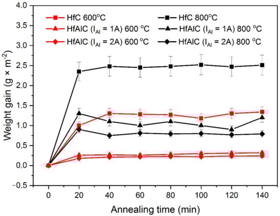 As can be seen in Figure 3, all of the synthesized Hf–Al–C and HfC films exhibit parabolic oxidation kinetics for both 600 and 800 °C annealing regime, reaching a saturation at 30 min after the annealing start. We attribute this saturation to the formation of the protective amorphous Al2O3 on the top of Hf–Al–C film and HfO2 on the top of HfC film. Furthermore, regardless of the annealing temperature, the Hf–Al–C system shows improved oxidation resistance compared to the HfC film. Thus, the HfC film annealed at 600 °C shows the average weight gain value of 1.53 g·m−2 whereas the Hf–Al–C (IAl = 1 A) film with a minimal addition of Al, annealed at a higher temperature (800 °C;), had an average weight gain value of 1.05 g·m−2. The obtained experimental data show that in the case of annealing at 600 °C, the Hf–Al–C (IAl = 1 A, Al conc. 5.6 at.%) and Hf–Al–C (IAl = 2A, Al conc. 9.2 at.%) films show a decrease in the weight gain value by 4.3 and 5.7 times in relation to the sample with a HfC coating, respectively. At the annealing temperature of 800 °C, the weight gain value for the same samples decreases by 2.4 and 3.2 times, respectively.